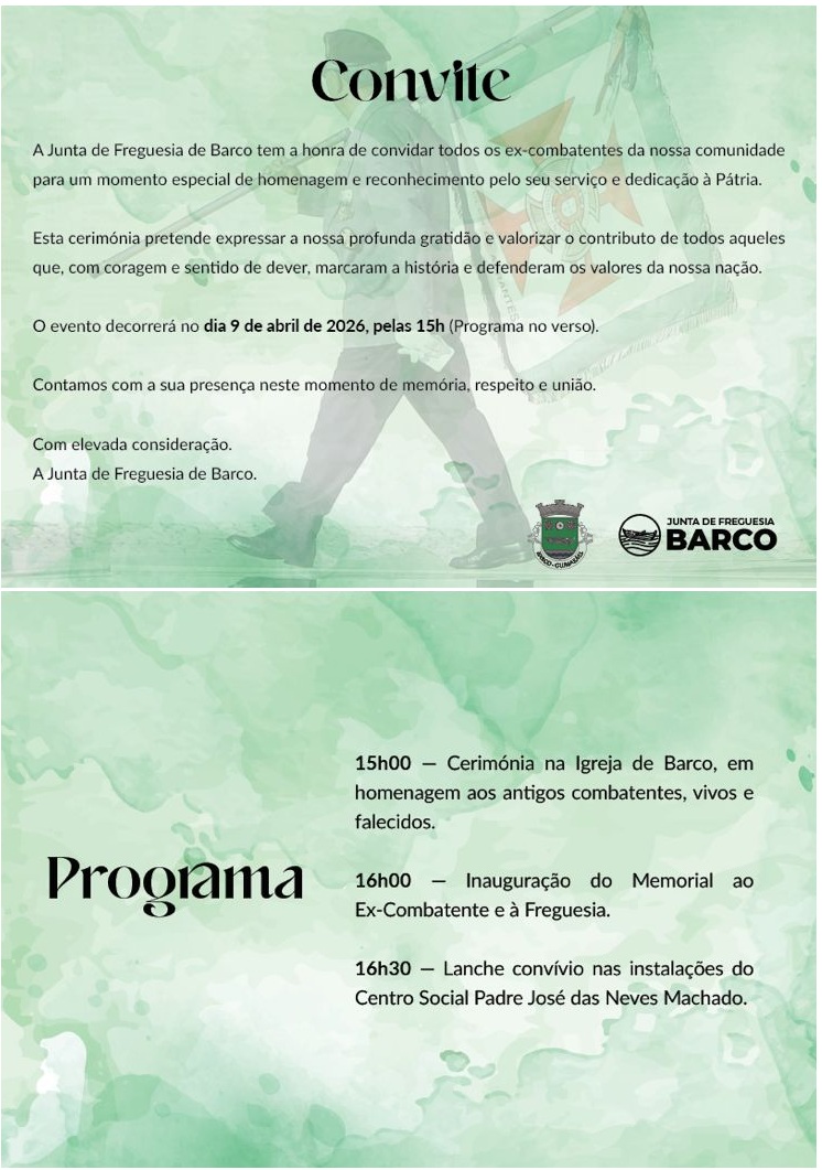 - A cerimónia terá início às 15h00, na Igreja de Barco, seguindo-se a inauguração do Memorial ao Ex-Combatente e um momento de convívio.